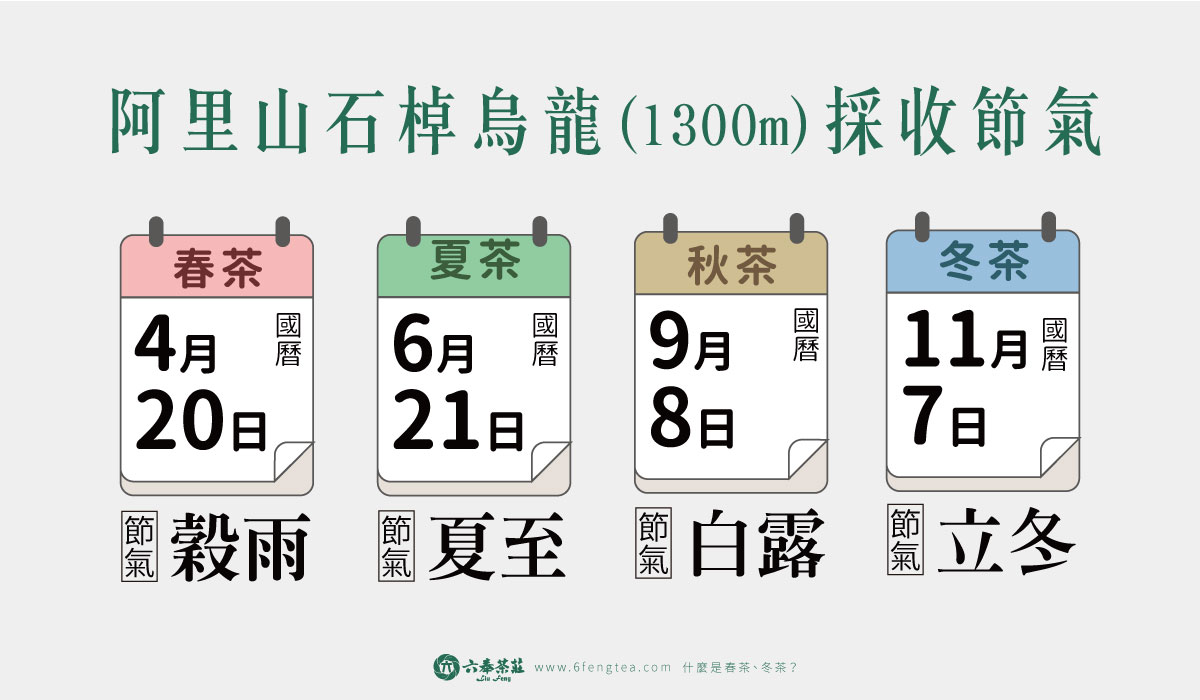 以阿里山石棹 1300 公尺的青心烏龍為例,一年約可採收四次,但因每年氣候不定,有時暖冬有時寒冬,所以採收時間可能會有幾天的差異:- 春茶:穀雨前後(約 4 月 20 日)