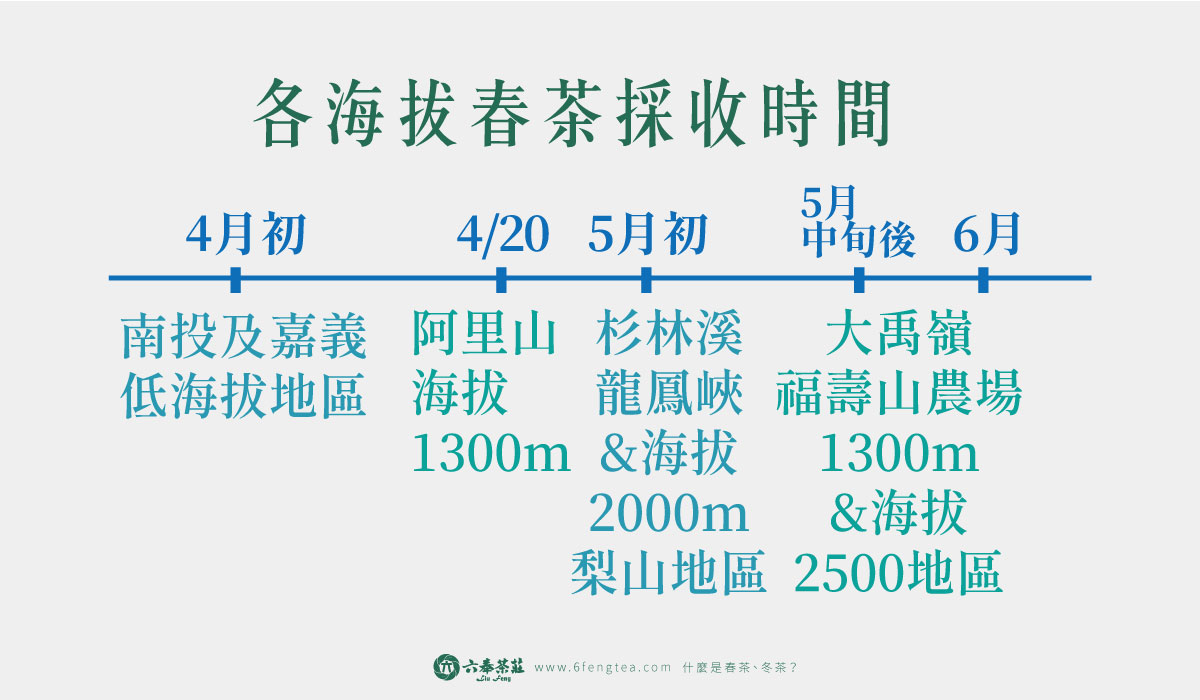 南投、嘉義的低海拔茶區大約在 4 月初開始採收,海拔 1300 公尺的阿里山石棹茶區大約在 4 月 20 日(穀雨節氣),而杉林溪龍鳳峽或2000公尺左右的梨山茶則落在 5 月初,更高海拔2500公尺的大禹嶺與福壽山甚至要等到 5 月中旬之後。