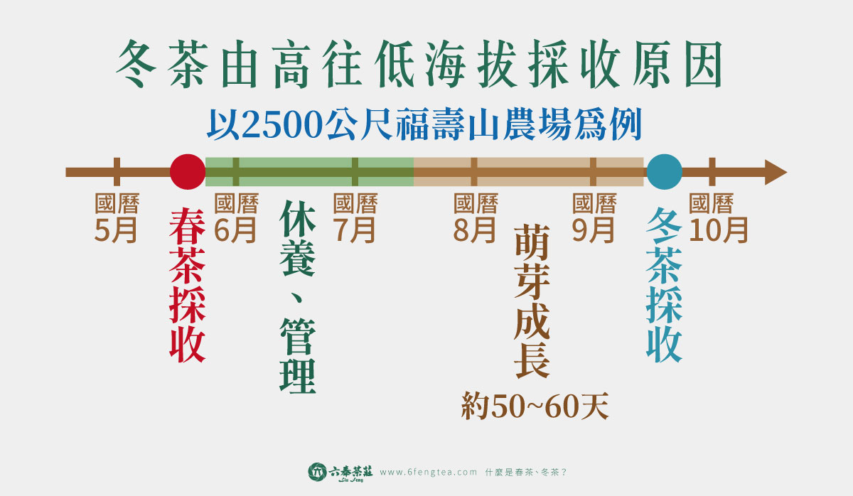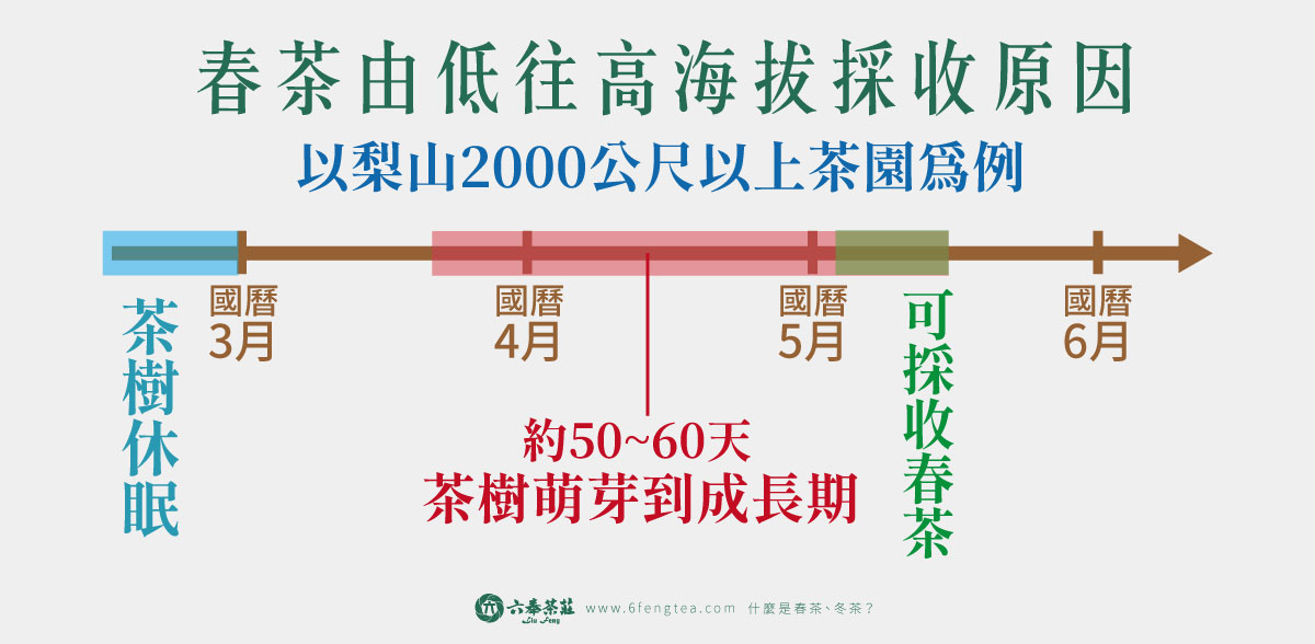 這與氣溫變化密切相關。立春之後氣溫逐漸升高,而氣溫會隨海拔上升而下降──每上升 100 公尺,平均氣溫約會下降 0.6°C。也就是說,海拔 2000 公尺的梨山地區,比平地約低了 12°C。茶樹最適宜的生長溫度約為 18~25°C,若氣溫降至 5°C 以下,茶樹就會進入休眠狀態。以梨山為例,當地 2000 公尺以上的茶園在農曆春前仍多處於冬眠期,需等到 3 月中旬左右氣溫回升後,茶樹才開始萌芽。從萌芽到可採收約需 50 天左右,因此通常會在 5 月初至中旬迎來採收期。 -