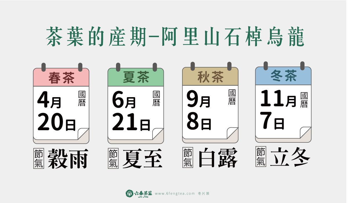 以海拔約 1300 公尺的 阿里山石棹茶區、青心烏龍品種 為例,一年大約可採收四次:春茶:約 4 月下旬