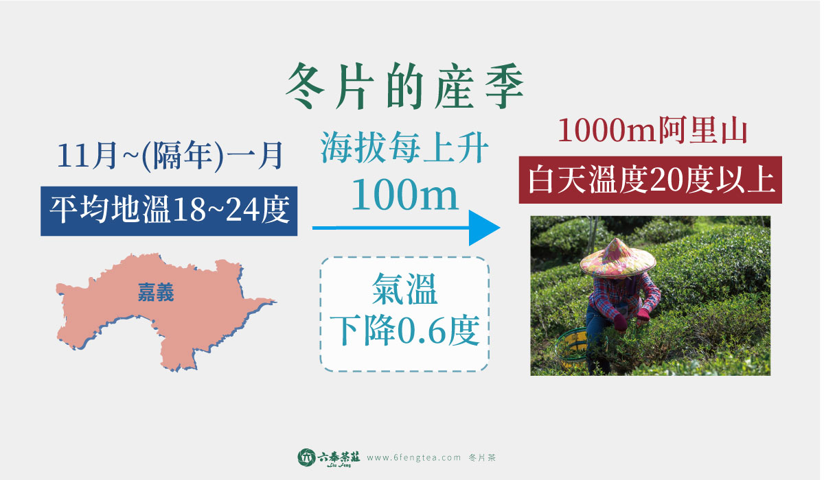 近年因為全球暖化,冬季氣溫相較以往偏高。以嘉義平地來說,11 月至 1 月的平均氣溫約在 18–24°C 之間。再加上海拔每上升 100 公尺,氣溫約下降 0.6°C,換算後,海拔 1300 公尺的茶園白天有時仍可達 20°C 左右。