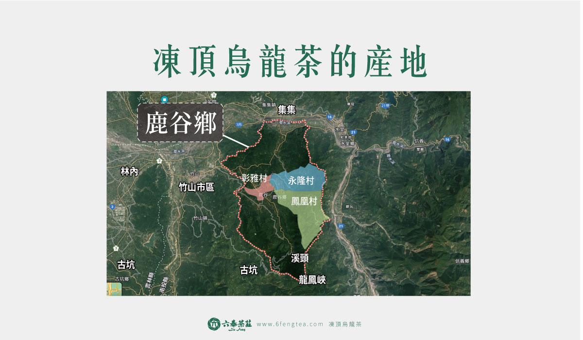 「凍頂」原本指的是南投縣鹿谷鄉麒麟潭旁的凍頂山,海拔約 750 公尺,主要涵蓋彰雅、鳳凰、永隆等地區,廣義來說即屬於鹿谷鄉茶區。鹿谷鄉是台灣最早發展茶葉種植的地區之一,在民國 60~70 年代達到全盛時期,是台灣烏龍茶發展史上極為重要的核心產區。
