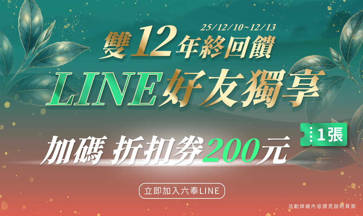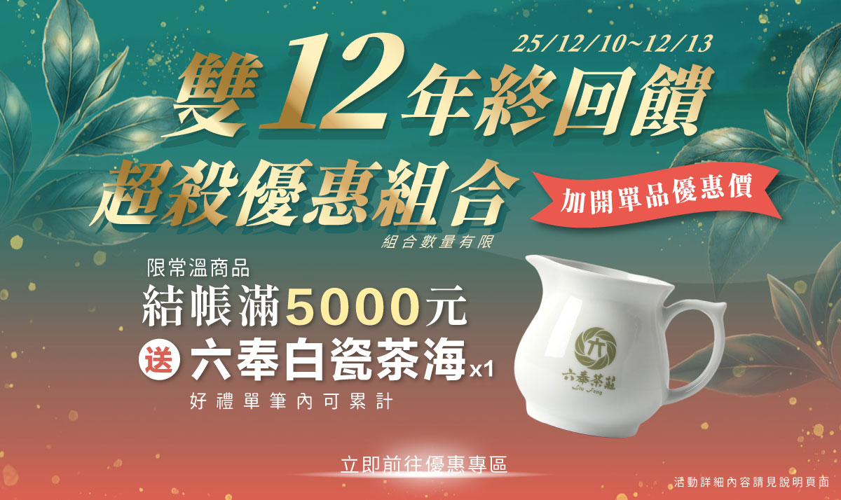 ![]() ![]() 2025雙12年終回饋 超殺優惠專區│滿額送好禮│LINE好友獨享折扣券 ▇ 活動日期:2025/12/10(三)~2025/12/13(六) ▇ 活動內容:門市、官方商城 適用本活動 ① 超殺優惠茶葉組合 ,點擊前往 ② 滿額贈好禮(限常溫商品): ◆ 單筆滿5000元 (實付金額 不包含運費) 送 六奉白瓷茶海1只 ※ 單筆內可累計【數量有限 ‧ 送完不補】舉例:滿5000元送1只茶海,滿10000元送2只,類推。 ③ LINE好友獨享200元折扣券 立即加入六奉茶莊LINE好友 ※系統結帳單筆訂單一次僅能使用一張折扣券,若有line會員折扣券、生日券,請擇一使用。
